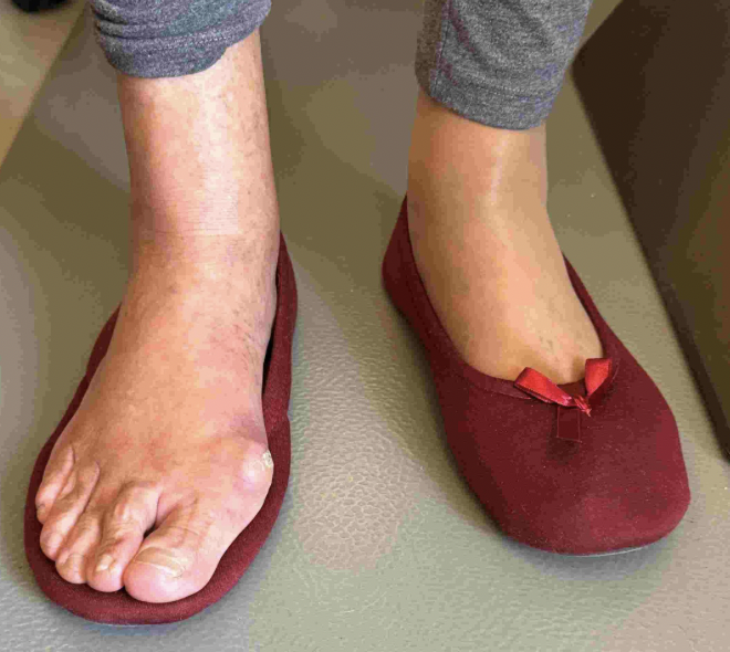 Όταν η παραμόρφωση προχωρήσει, το πόδι γίνεται πιο φαρδύ και ο ασθενής δυσκολεύεται να βρει παπούτσια.